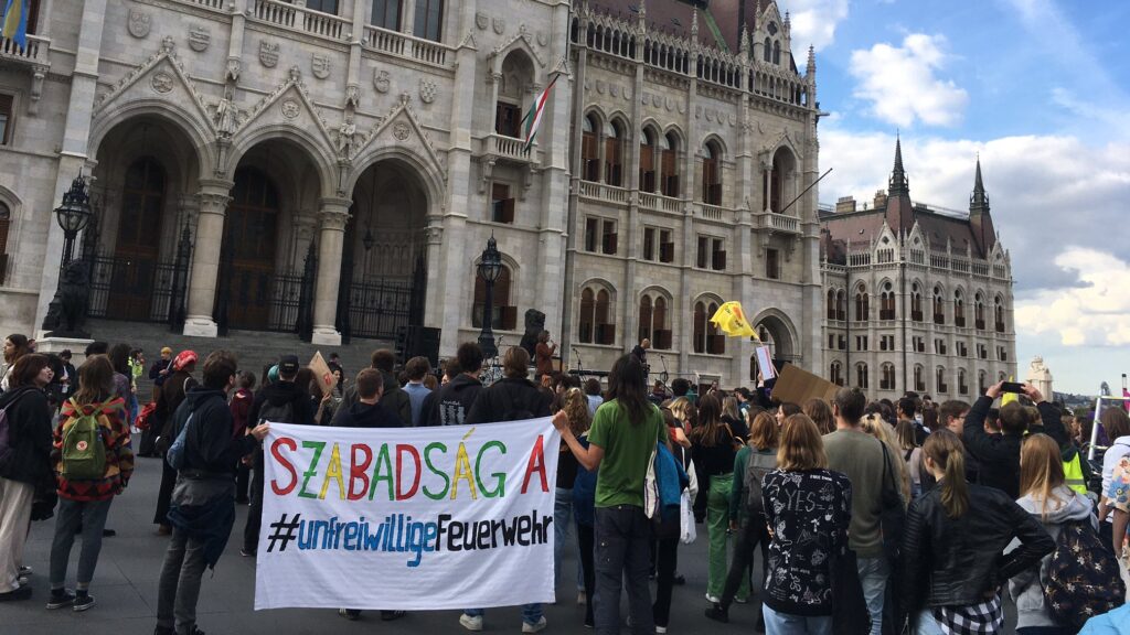 Budapest: Auch auf dem #Klimastreik in #Ungarn gibt’s Solidarität für die #unfreiwilligeFeuerwehr!