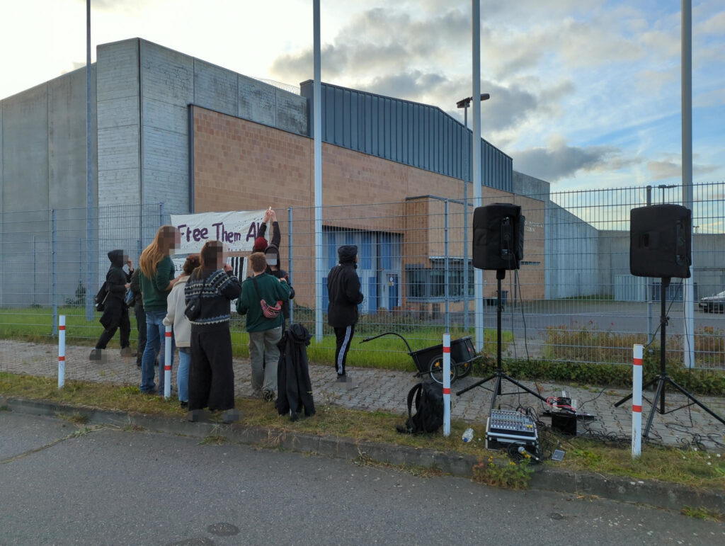Deshalb stehen wir hier nicht nur für unsere Freund*innen, sondern wegen euch allen. Freiheit für alle Gefangenen! Wir werden ein gutes Leben nur erreichen ohne Staat und Knäste. Lasst uns mutig sein und nicht nur die Kohlekaftwerke, sondern auch die Knäste abschaffen – bis alle frei sind. Mit Power durch die Mauer, bis sie bricht!