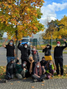 Wir stehen hier, weil auch unsere Freund*innen und Kompliz*innen heute hier eingesperrt sind. Weil sie und andere das ungebremste Rasen in die Klimakatastrophe nicht länger hinnehmen wollten und den Kohleausstieg selbst in die Hand genommen haben – zumindest für ein paar Stunden und so mehr CO2 eingespart haben, als das hier über persönliche Konsumentscheidungen möglich wäre. Wir könnten jetzt jammern, dass der Staat aber ungerecht ist und Klimaschützer*innen nicht eingesperrt gehören, weil wir ja letzendlich nur eine Erde haben wollen, auf der wir gut leben können.
